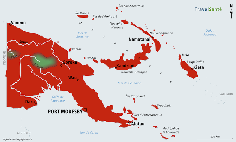 Données limitées ; cas sporadiques signalés dans les provinces occidentales ; 1 cas signalé près de Port Moresby. Sérodétection dans les provinces du Golfe et les hautes terres méridionales. Probable circulation du virus dans l’ensemble du pays. Vaccination pour les séjours prolongés (plus d'un mois) en zones rurales, ou en cas d'activités extérieures en zones rurales, surtout au coucher du soleil.